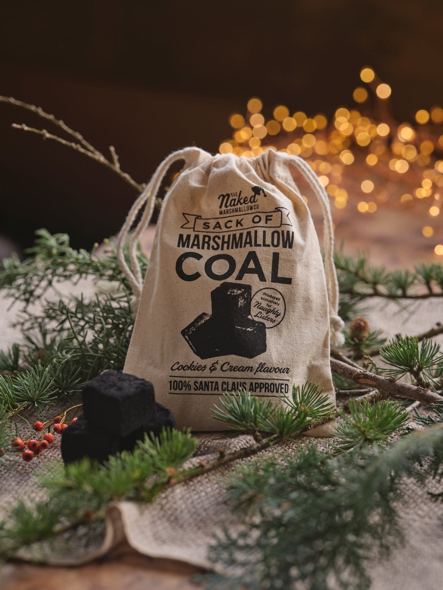 A perfect stocking filler for those on the naughty list this year - a sack of gourmet cookies and cream marshmallows - made to look just like real lumps of coal.